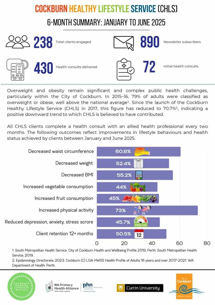 The Cockburn Healthy Lifestyle Service (CHLS) supports adults in improving their nutrition, physical activity, and mental wellbeing. Launched in 2017 to address rising rates of overweight and obesity in the City of Cockburn, CHLS has since grown to offer a wide range of services that take a holistic approach to health.